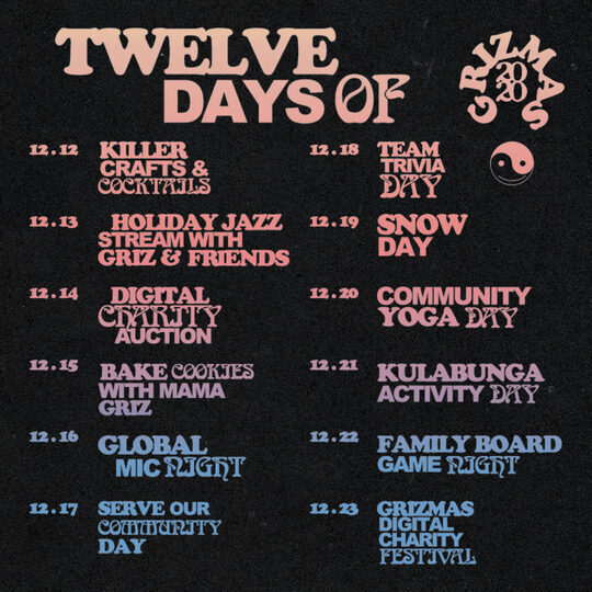 GRiZ‘s annual charity series 12 Days of GRiZMAS was just announced and we are ready for lots of face time with one of our favorite humanitarians. Happening over Twitch and Zoom this year, the virtual events will run from December 12-23 and raise money for non-profit Seven Mile Music, which benefits music, arts, and coding programs for Detroit’s inner city youth.
