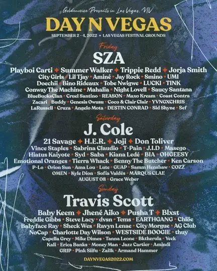 Joining Travis Scott on the Day N Vegas lineup are headliners SZA and J. Cole, as well as Playboi Carti, Baby Keem, Pusha T, and many other solidified and up-and-coming rappers.